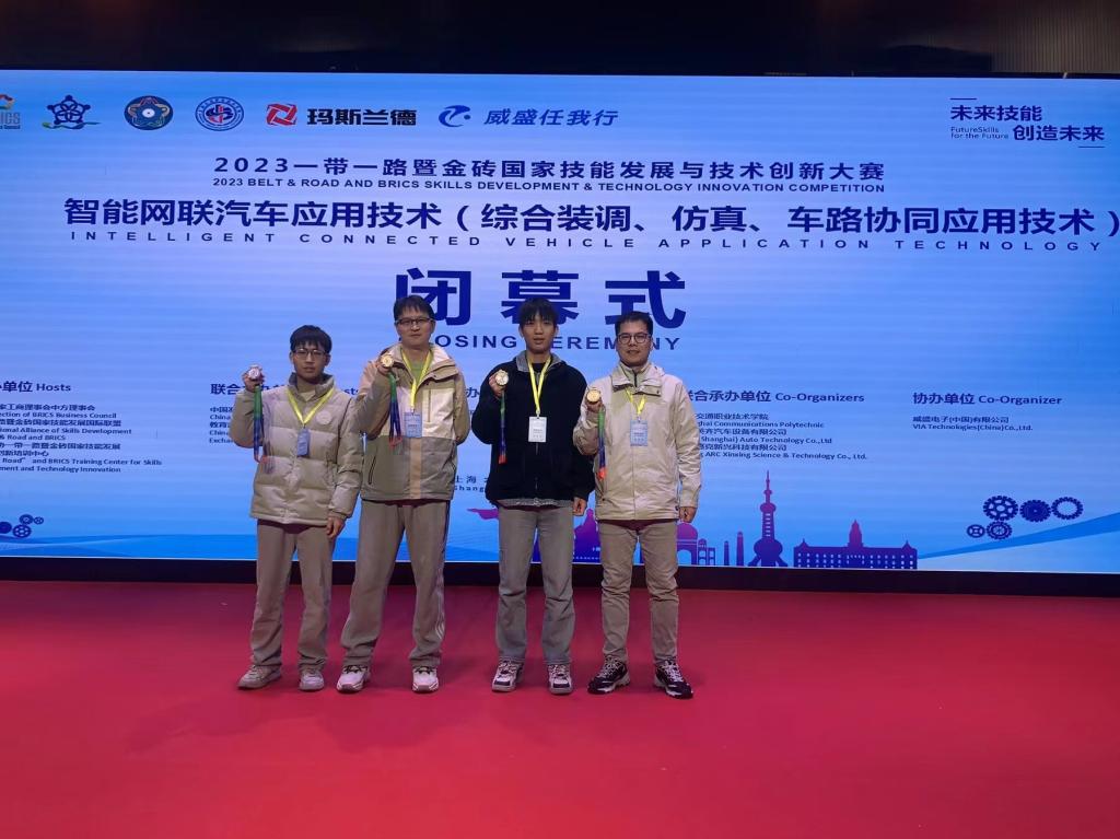 (通讯员:张超)12月14日至17日,第七届金砖国家技能发展与技术创新大赛智能网联汽车应用技术赛项在上海交通职业技术学院举行。经过激烈比拼,太阳官网太阳集团tyc33455官网张超、陈高峰组成的教师代表队以职工组总分第一的成绩力夺金牌,李书洋、綦凌组成的学生代表队在高职组喜获银牌。