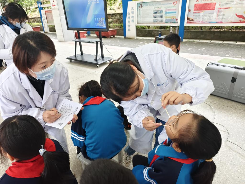 活动现场,来自十堰市人民医院的医疗专家团队为同学们带来了丰富多样的健康科普内容。首先,徐丽娟护士长以生动有趣的方式为同学们讲解了儿童口腔常见疾病的预防与治疗。通过详细的案例分析和深入浅出的讲解,同学们了解了这些口腔疾病的形成原因、危害以及预防措施。徐医生特别强调了保持良好的刷牙习惯和口腔卫生的重要性,现场示范了正确的刷牙方法并对小朋友们进行牙科义诊。
