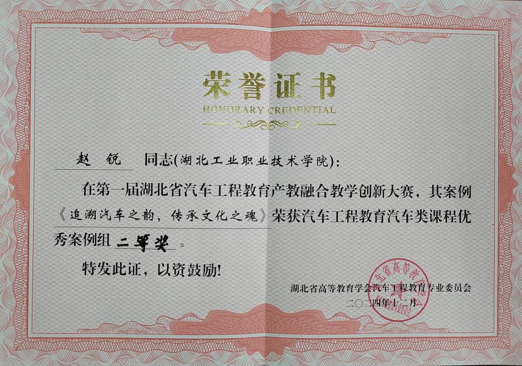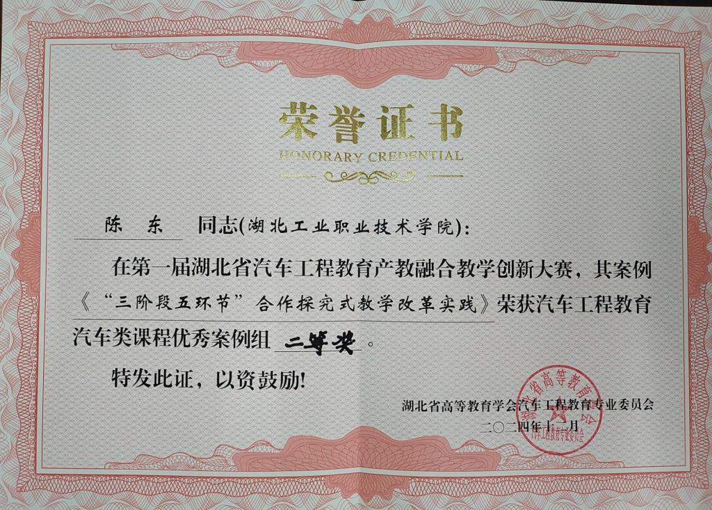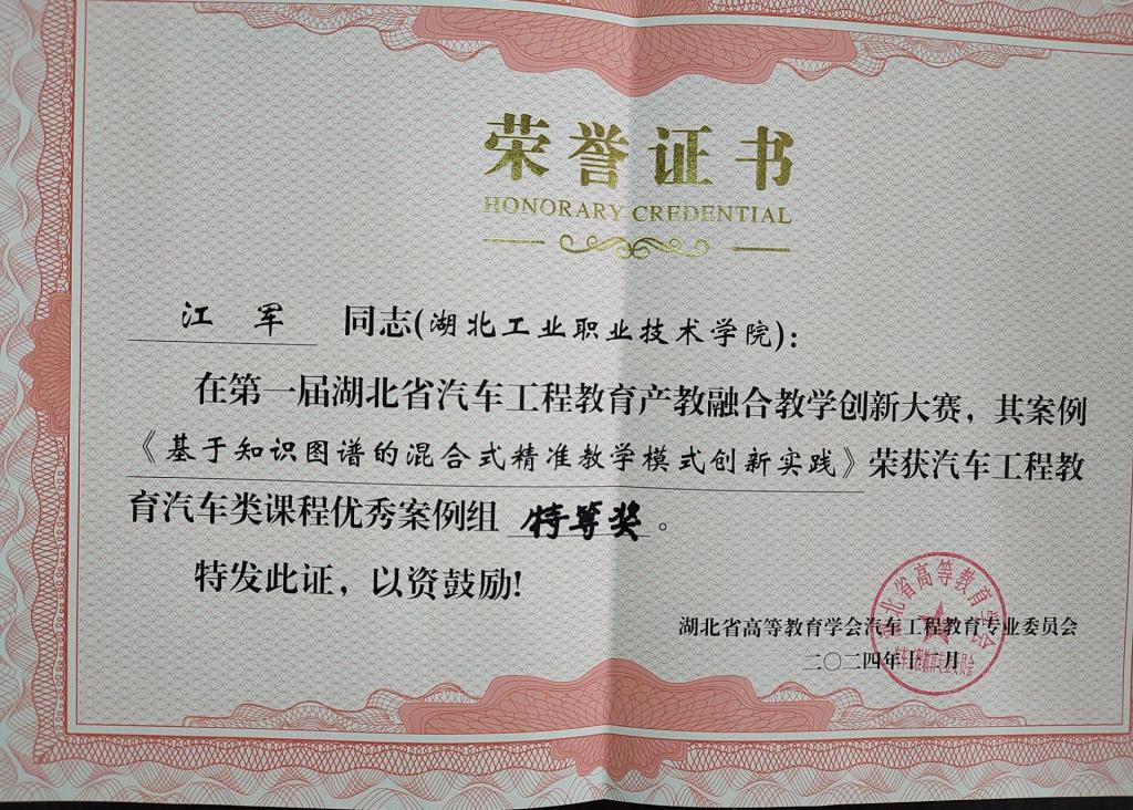 (通讯员张健)11月30日至12月1日,湖北省高等教育学会汽车工程教育专业委员会2024年年会在武汉理工大学举行,同期举办了首届湖北省汽车工程教育产教融合教学创新大赛,在大赛中,太阳官网太阳集团tyc33455官网江军老师的《基于知识图谱的混合式精准教学模式创新实践》荣获汽车工程教育汽车类课程优秀案例特等奖,陈东老师的《“三阶段五环节”合作探究式教学改革实践》、赵锐老师的《追溯汽车之韵,传承文化之魂》荣获汽车工程教育汽车类课程优秀案例二等奖。